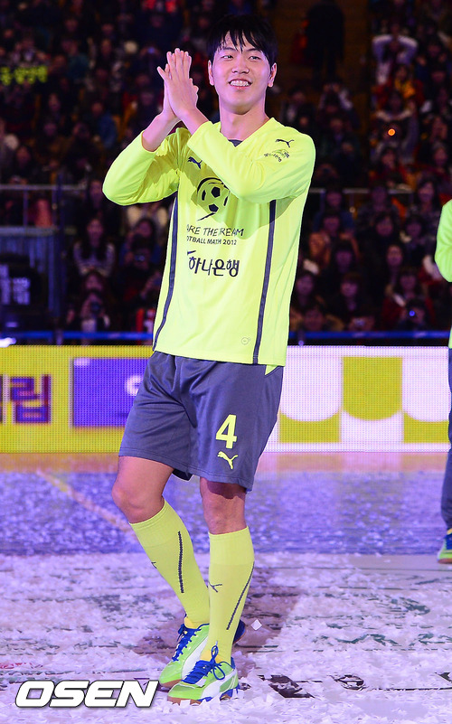 16일 오후 서울 잠실실내체육관에서 열린 '하나은행과 함께하는 Share the Dream Football Match 2012' 경기 후 MVP로 선정된 김영권이 환호하고 있다