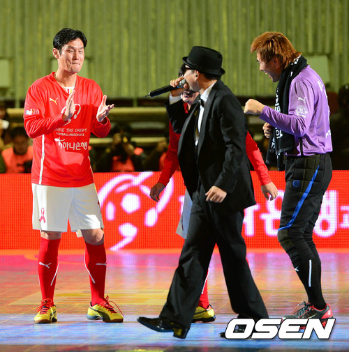 16일 오후 서울 잠실실내체육관에서 열린 '하나은행과 함께하는 Share the Dream Football Match 2012' 경기, 가수 박상민의 축하공연때 최용수 감독이 무대에서 춤을 추고 있다.
