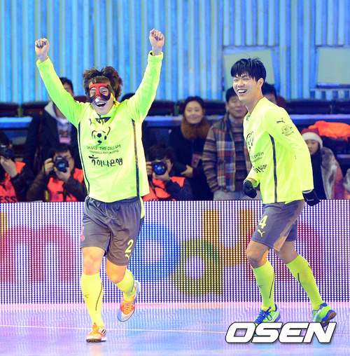 16일 오후 서울 잠실실내체육관에서 열린 '하나은행과 함께하는 Share the Dream Football Match 2012' 경기, 런던올림픽 선수팀과 코치팀의 경기에 앞서 선수팀 오재석이 골을 성공시키고 환호하고 있다.