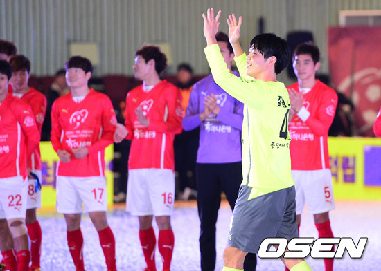 16일 오후 서울 잠실실내체육관에서 열린 '하나은행과 함께하는 Share the Dream Football Match 2012' 경기, 경기 후 MVP로 선정된 김영권이 손을 흔들며 기뻐하고 있다.