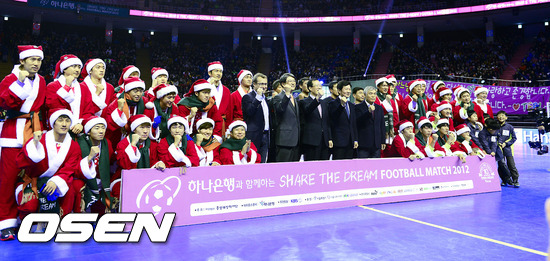 16일 오후 서울 잠실실내체육관에서 열린 '하나은행과 함께하는 Share the Dream Football Match 2012' 경기 전 출연 선수들이 포즈를 취하고 있다.