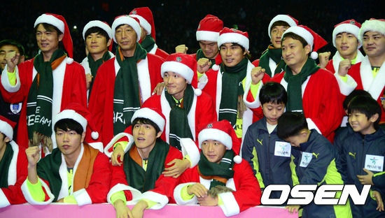 16일 오후 서울 잠실실내체육관에서 열린 '하나은행과 함께하는 Share the Dream Football Match 2012' 경기, 경기에 앞서 산타 옷을 입은 사랑팀 선수들이 기념촬영을 하고 있다.