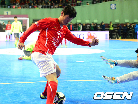 16일 오후 서울 잠실실내체육관에서 열린 '하나은행과 함께하는 Share the Dream Football Match 2012' 경기, 후반 최용수 감독이 슛을 시도하고 있다.