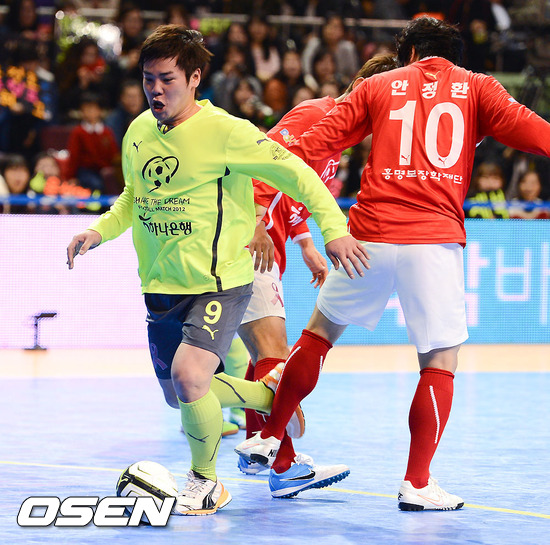 16일 오후 서울 잠실실내체육관에서 열린 '하나은행과 함께하는 Share the Dream Football Match 2012' 경기, 구자명이 안정환을 상대로 돌파하고 있다