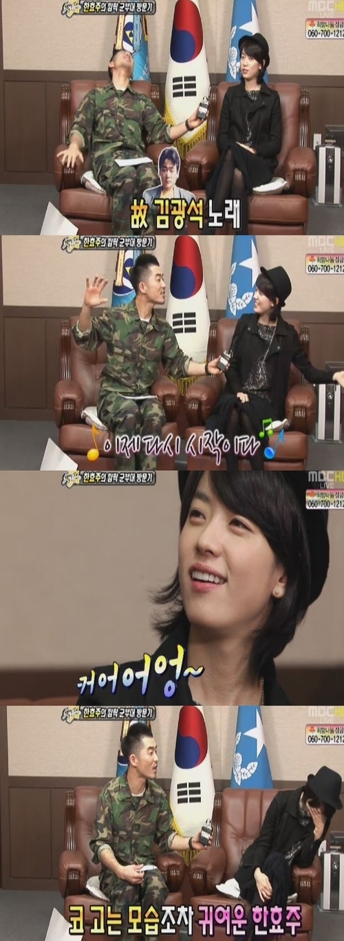한효주는 16일 오후 방송된 MBC '섹션TV 연예통신'에 출연, 공군 부대를 방문해 이루어진 인터뷰에서 노래방 애창곡이 무엇이냐는 질문에 “주로 故 김광석의 노래를 부른다”고 말한 후 “‘이등병의 편지’를 좋아한다”고 고백했다.