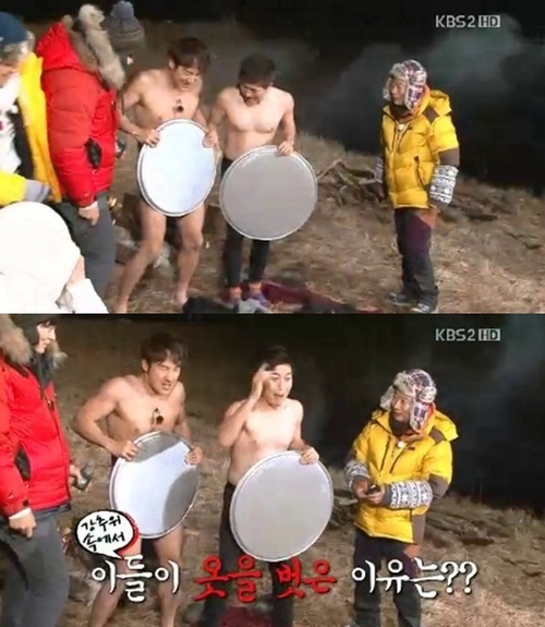 엄태웅과 김종민은 16일 오후 방송된 KBS 2TV 예능프로그램 '해피선데이-1박 2일(이하 '1박 2일')' 예고편에서 옷을 벗은 채로 나타나 눈길을 끌었다.