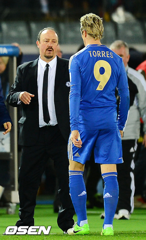 경기를 마치고 첼시의 라파엘 베니테스 감독이 페르난도 토레스를 격려하고 있다. / rumi@osen.co.kr
