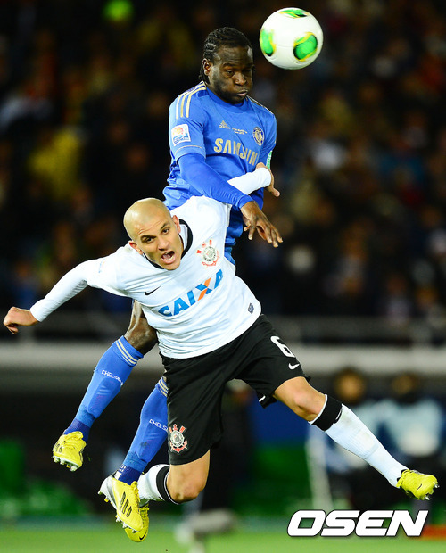 후반 첼시 빅토르 모세스가 코린티안스 파비오 산토스와 공중볼 다툼을 하고 있다 . / rumi@osen.co.kr
