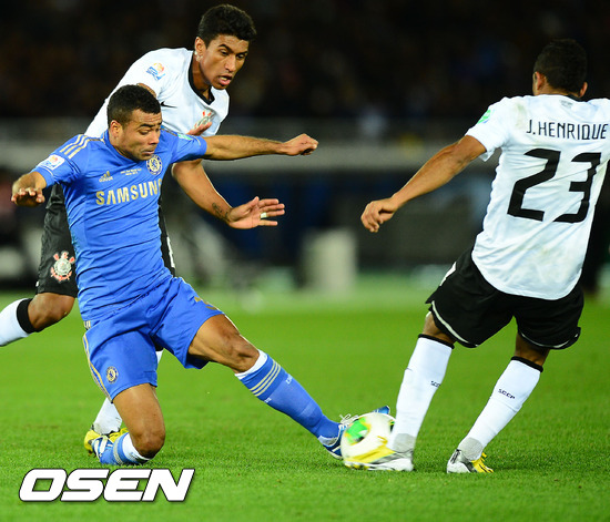 후반 첼시 애쉴리 콜이 슛을 시도하려 할때 코린티안스 조르제 헨리케가 볼을 걷어내고 있다./ rumi@osen.co.kr