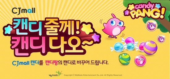 위메이드엔터테인먼트의 ‘캔디팡’이 14일 온라인 쇼핑몰 CJ몰과 제휴, 프로모션 ‘캔디 줄게, 캔디 다오’를 시작했다고 17일 밝혔다.