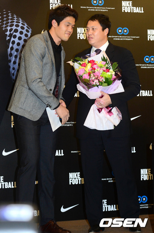 이운재가 17일 오후 서울 삼성동 라마다 서울호텔에서 열린 은퇴 기자회견에서 정성룡에게 꽃다발을 받고 있다.