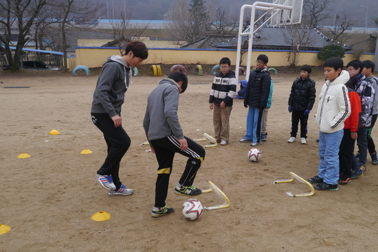 김인한 최영준 윤일록은 오전 10시부터 2시간동안 함안 문암초등 학교 에서 학생 41명과 함께 패스 드리볼 슈팅 등 축구와 관련된 수업을 진행하 면서 팬 사인회를 갖고 기념사진도 찍었다.