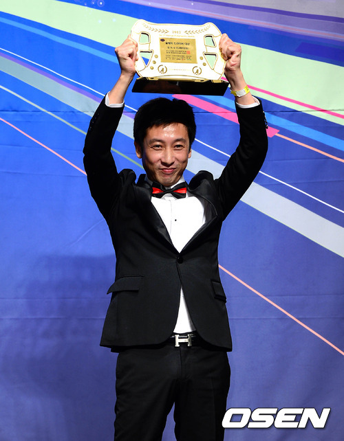 17일 오후 서울 양재동 엘타워 그랜드홀에서 열린 '2012 KARA 모터스포츠인의 밤-제7회 2012 한국모터스포츠 어워즈'에서 올해의 드라이버 대상을 수상한 CJ레이싱팀의 김의수가 기념촬영을 하고 있다.