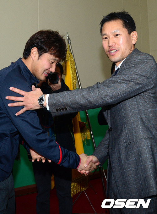18일 오전 경기 성남 탄천종합운동장에서 진행된 '성남 안익수 감독 상견례 및 취임 공식기자회견'에서 성남 안익수 감독이 황재원과 악수를 나누고 있다.