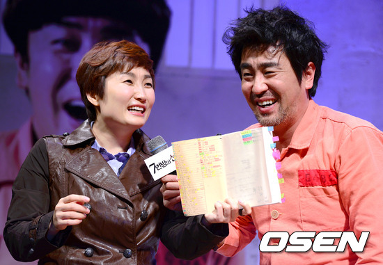 18일 오전 서울 압구정CGV에서 열린 '7번방의 선물' 제작보고회에서 류승룡 대본을 보며 박경림과 류승룡이 웃고 있다.