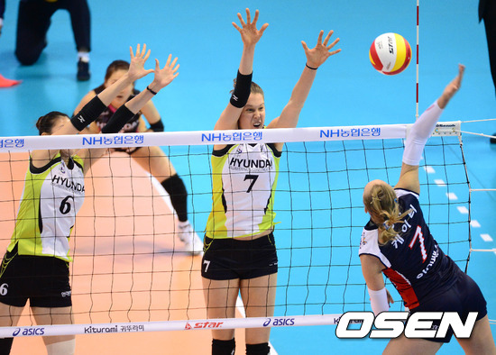 18일 오후 대전 충무실내체육관에서 열린 '2012-2013 NH농협 V-리그' 여자부 KGC인삼공사와 현대건설의 경기, 1세트 현대건설 야나가 인삼공사 케이티의 공격을 막고 있다.
