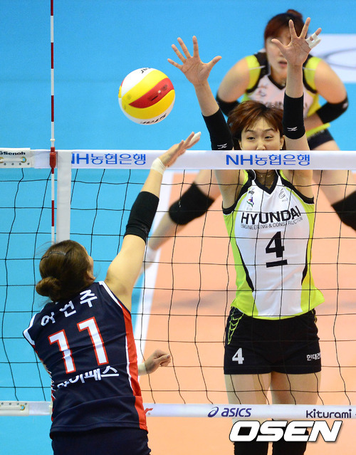 18일 오후 대전 충무실내체육관에서 열린 '2012-2013 NH농협 V-리그' 여자부 KGC인삼공사와 현대건설의 경기, 1세트 현대건설 황연주가 인삼공사 이연주의 공격을 막고 있다.