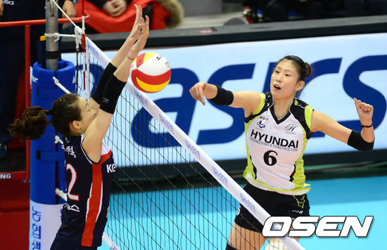 18일 오후 대전 충무실내체육관에서 열린 '2012-2013 NH농협 V-리그' 여자부 KGC인삼공사와 현대건설의 경기, 1세트 현대건설 김수지가 공격을 시도하고 있다.
