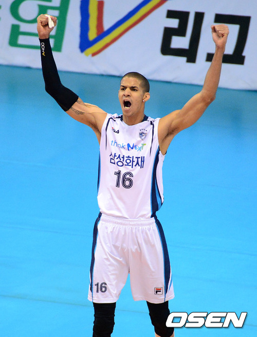 18일 오후 대전 충무실내체육관에서 열린 '2012-2013 NH농협 V-리그' 남자부 삼성화재와 KEPCO의 경기, 1세트 득점에 성공한 삼성화재 레오가 환호하고 있다.