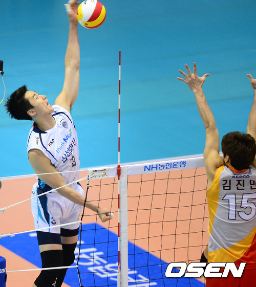 18일 오후 대전 충무실내체육관에서 열린 '2012-2013 NH농협 V-리그' 남자부 삼성화재와 KEPCO의 경기, 1세트 삼성화재 박철우가 스파이크를 날리고 있다.