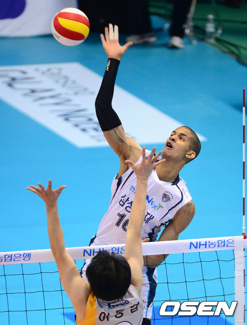 18일 오후 대전 충무실내체육관에서 열린 '2012-2013 NH농협 V-리그' 남자부 삼성화재와 KEPCO의 경기, 1세트 삼성화재 레오가 스파이크를 날리고 있다.