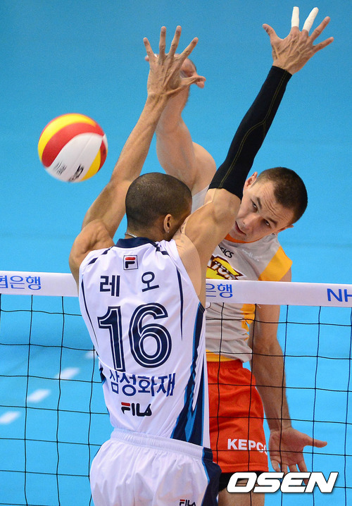 2세트 KEPCO 안젤코가 삼성화재 레오의 블로킹을 피해 스파이크를 날리고 있다./sunday@osen.co.kr