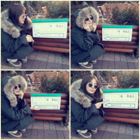 첫 번째 사진 속 윤은혜는 투표소 표시 옆에 쭈그리고 앉아 포즈를 취하고 있다. 털모자가 달린 두꺼운 코트에 검정색 선글라스를 낀 차림이다. 평소 패셔니스타인 만큼 독특한 의상이 눈길을 끈다.