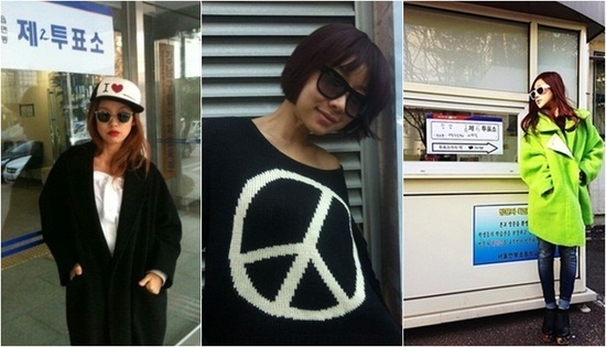 또한 배우 곽현화는 추운 날씨 속에서도 노출 의상을 입고 등장, 시선을 모았다. 검정 니트 티셔츠를 입고 한 쪽 어깨를 내놓은 채 투표 인증샷을 찍은 것.