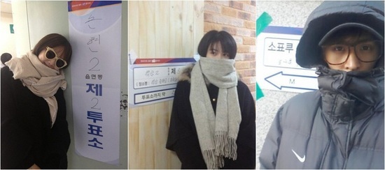 배우 윤승아는 추위를 피하기 위해 목도리를 칭칭 두르고 찍은 투표 인증샷을 공개했다. 그의 얼굴 절반이 선글라스와 목도리에 의해 가려졌지만 감출 수 없는 미모가 특히 눈길을 끌었다.