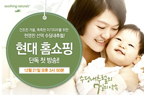 현대홈쇼핑을 통해 겨울철 트고 건조해지기 쉬운 아기 피부를 건강하게 유지해주는 수딩내추럴 포밍워시 3개, 너리싱 로션 3개, 인텐스 모이스처 크림 1개의 수딩내추럴 3종 세트 단독구성을 크리스마스 같은 특별 할인가로 구매 가능하다.