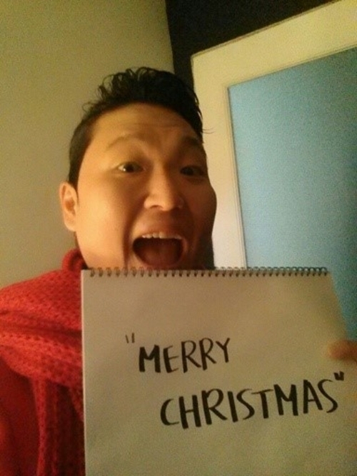 공개된 사진 속 싸이는 빨간 상의와 목도리를 착용하며 크리스마스 분위기를 물씬 풍기고 있다. 또 그는 입을 크게 벌리고 초롱초롱한 눈망울로 카메라를 응시하면서 ‘메리크리스마스’라고 손수 적은 스케치북을 들고 있어 눈길을 끈다.