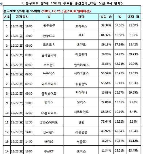 농구토토 승5패 15회차 투표율 중간 집계 결과