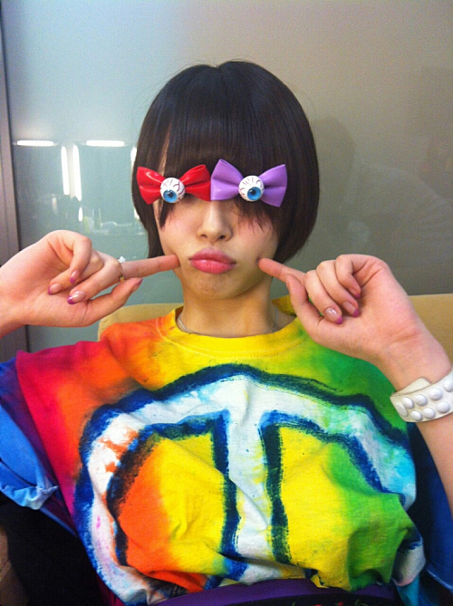 사진 속 설리는 빨간색과 보라색 리본이 달린 파란색 눈을 자신의 눈 앞에 붙인 채 독특한 표정을 짓고 있다. 알록달록한 색깔의 티셔츠와 눈에 붙인 특이한 장식물이 엉뚱한 매력을 드러내는 모습이다.