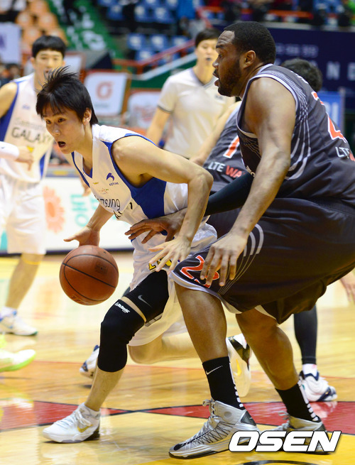 20일 오후 부산 실내체육관에서 열린 'KB 국민카드 2012-2013 프로농구' KT 소닉붐과 삼성 썬더스와의 3라운드 경기, 1쿼터 삼성 이시준이 수비를 뚫고 골밑 돌파를 하고 있다.