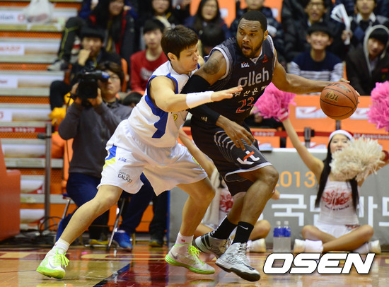 20일 오후 부산 실내체육관에서 열린 'KB 국민카드 2012-2013 프로농구' KT 소닉붐과 삼성 썬더스와의 3라운드 경기, 3쿼터 KT 존슨이 삼성 이규섭의 수비를 뒤로하고 공격을 시도하고 있다.