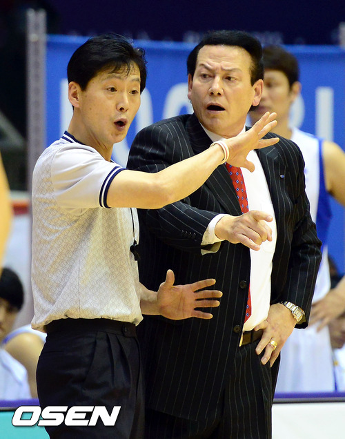20일 오후 부산 실내체육관에서 열린 'KB 국민카드 2012-2013 프로농구' KT 소닉붐과 삼성 썬더스와의 3라운드 경기, 4쿼터 삼성 김동광 감독이 심판에게 어필을 하고 있다.