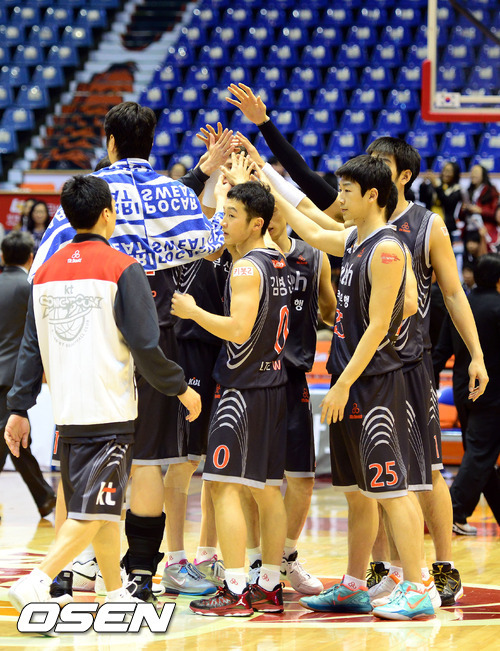 부산 KT는 20일 부산사직실내체육관에서 열린 '2012-2013 KB국민카드 프로농구' 서울 삼성과 3라운드 홈경기서 공수에서 만점 활약을 펼친 조성민의 맹활약에 힘입어 78-69로 승리하며 5연패의 늪에서 벗어났다.