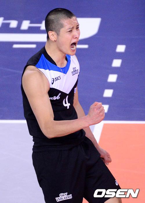 20일 오후 천안 유관순체육관에서 열린 '2012-2013 NH농협 V-리그' 남자부 현대캐피탈과 대한항공의 경기, 2세트 현대캐피탈 문성민이 득점에 성공한 후 환호하고 있다.
