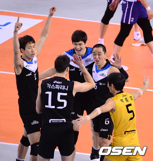 20일 오후 천안 유관순체육관에서 열린 '2012-2013 NH농협 V-리그' 남자부 현대캐피탈과 대한항공의 경기, 1세트 득점에 성공한 현대캐피탈 선수들이 환호하고 있다.