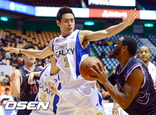 20일 오후 부산 실내체육관에서 열린 'KB 국민카드 2012-2013 프로농구' KT 소닉붐과 삼성 썬더스와의 3라운드 경기, 3쿼터 삼성 이관희가 KT 존슨의 공격을 수비하고 있다.