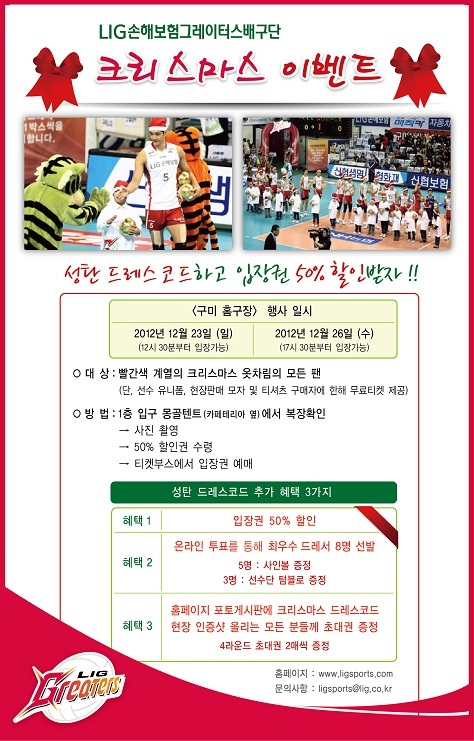 LIG손해보험은 크리스마스를 전후한 23일(vs 현대캐피탈)과 26일(vs KEPCO) 양일간 열리는 경기를 대상으로 LIG 팀 색깔인 레드계열의 옷을 착용한 모든 팬들에게 입장권의 50%를 할인해준다.