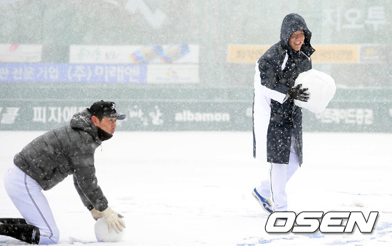 21일 오후 서울 목동구장에서 열린 이두환 돕기 자선경기 시작 전 김현수와 김창렬이 눈사람을 만들고 있다.