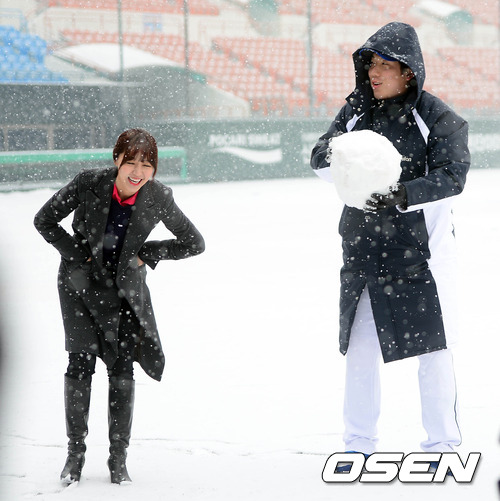 21일 오후 서울 목동구장에서 열린 이두환 돕기 자선경기 시작 전 김현수와 김민아 아나운서가 장난을 치고 있다.