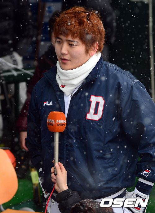 21일 오후 서울 목동구장에서 열릴 예정이던 이두환 돕기 자선경기가 폭설로 취소됐다. 임태훈이 인터뷰를 하고 있다.