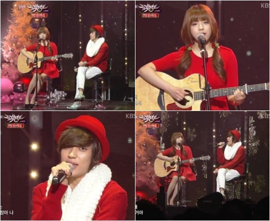 니엘과 주니엘은 21일 오후 6시 10분 방송된 KBS 2TV '뮤직뱅크'에 출연해 틴탑의 노래 ‘나랑 사귈래’를 어쿠스틱 기타의 감미로운 사운드와 함께 열창했다.
