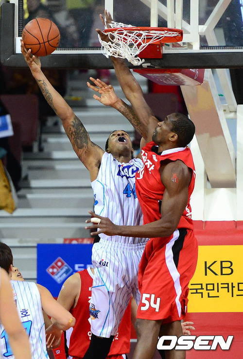 21일 오후 경기 안양실내체육관에서 열린 'KB 국민카드 2012-2013 프로농구' 안양 KGC와 전주 KCC의 경기, 3쿼터 KGC 키브웨가 슛을 시도하는 KCC 심스를 막고 있다.