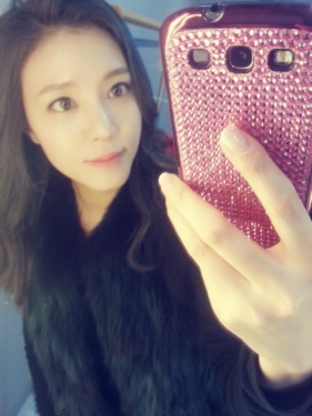 사진 속 정시아는 검정색 퍼재킷을 입고 자주색 핸드폰 카메라로 셀카를 찍고 있다. 커다란 눈과 붉은 입술, 결점없는 깨끗한 피부가 돋보이는 모습이다.