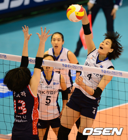 3세트 IBK기업은행 김희진이 KGC인삼공사 유미라의 블로킹을 피해 강타를 날리고 있다./jpnews@osen.co.kr