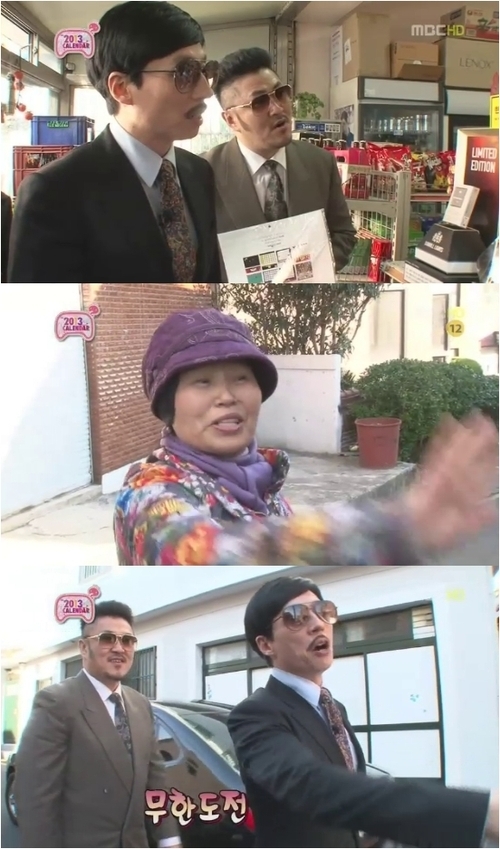 대신 유재석은 데프콘과 함께 부산을 종횡무진했다. 이들은 모두 웃긴 분장을 하고 시종일관 유행어인 “살아있네”를 연발하며 지루할 수 있는 달력배송에 활력을 불어넣었다. 멤버들도 웃겼지만 이날 진짜 웃겼던 웃음 포인트는 배송 과정 중 만난 시민들이었다.