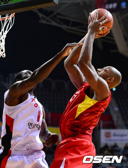 23일 오후 경기 고양체육관에서 열린 'KB 국민카드 2012-2013 프로농구' 고양 오리온스와 안양 KGC의 경기, 2쿼터 오리온스 윌리엄스가 KGC 파틸로의 슛블록을 피해 점프슛을 시도하고 있다.